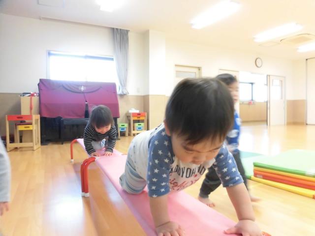 ホールで大きなマットの上でジャンプをしたり、平均台の上を慎重に渡ったりと身体を動かして遊びました('ω')ノ