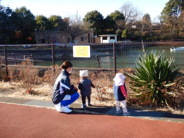 朝は肌寒かったですが、日が出てくると暖かくなったので、日立団地へのお散歩でも気持ち良く歩けました。ことり組のお友達はお散歩車で、あひる、うさぎ組のお友達は手を繋いで歩きました。