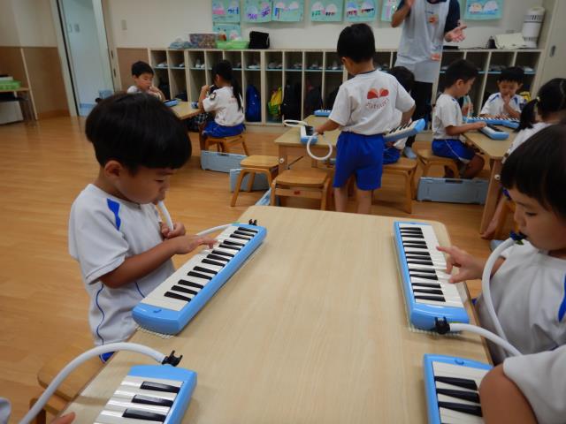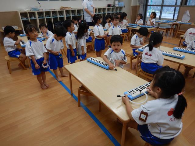 今日も朝から涼しい3クラス合同で過ごしました。鍵盤ハーモニカ指導、体操指導ではりす組ときりん、ぞう組に分かれて活動しました。