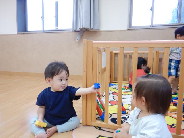 外はあいにくの雨なので、ことり組のお部屋に行ってはらぺこあおむしの滑り台やマット山、サークルの中にブロックを広げて好きな場所で遊びました!