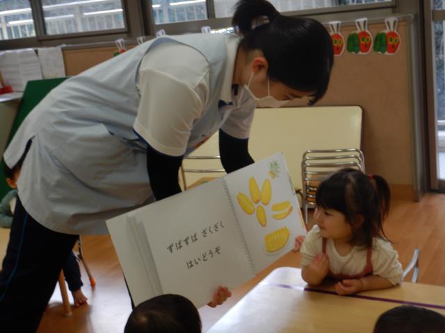朝の隙間時間でカード遊び♩保育者の言葉を復唱して言えたお友達は、その食べ物のカードをゲット!