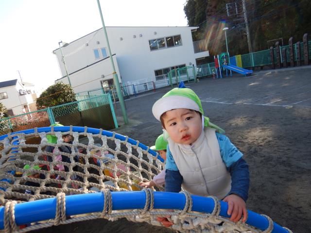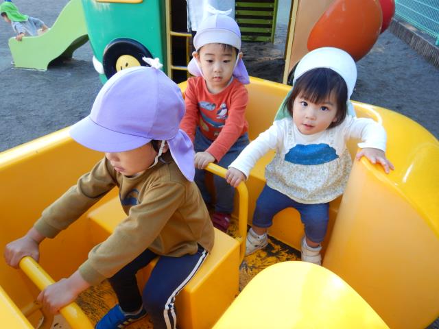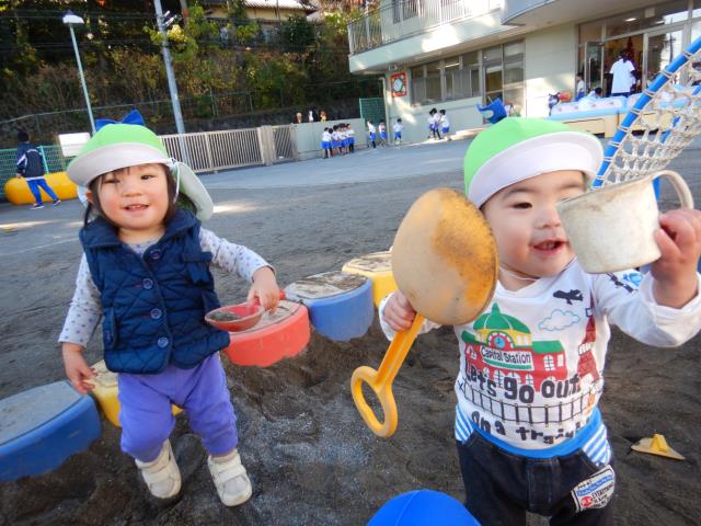気温は低めですが空がすっきり晴れて、気持ち良く園庭遊びを楽しめました。他のクラスのお友達も園庭に出ていて、玩具を貸してもらったり一緒に滑り台に登ったりと、沢山関わりをもち遊ぶことができました。