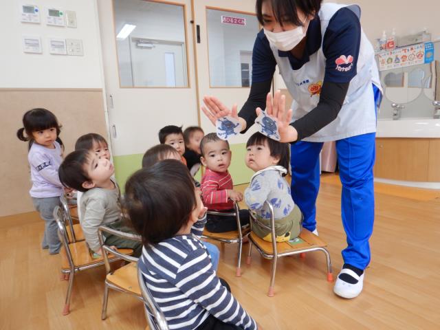 紙芝居で手洗いの大切さを教えてもらったり、音楽に合わせて実際に手を洗いました。