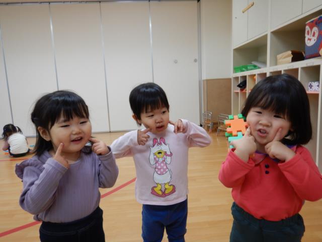 みんなで写真を撮ろう!と「可愛いポーズして~」と声をかけると、自分からピースが出来る子がたくさんいてびっくり!細かい指の動きが上手になってきたことが分かります。