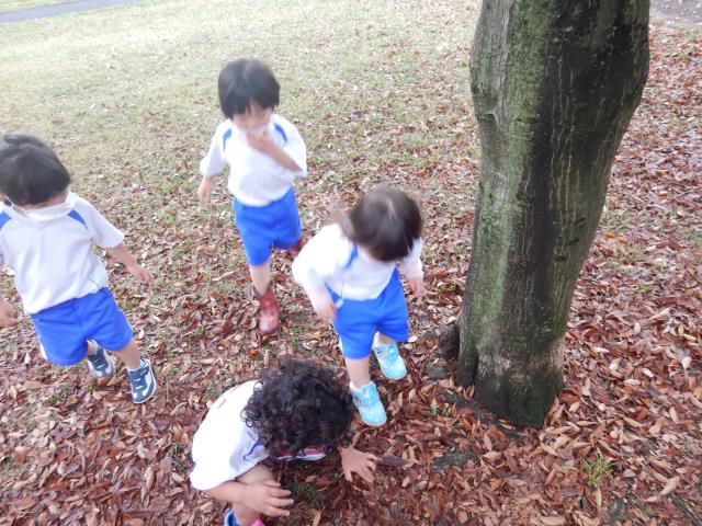 落ち葉や木の実を探し、お友達同士で見せ合いっこをしたり、「かわいいどんぐりがあったよ」と教えてくれるお友達もいました!小さい秋を見つけ嬉しそうな子ども達でした♡