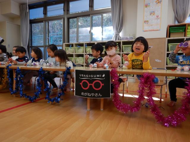 そして、うさぎ組は模倣遊びで「めがねやさん」を行ないました!自分達で作った眼鏡が机の上に並び、始まる前からワクワクな子ども達!