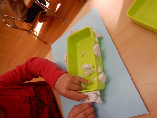 ばい菌の形をした紙石鹸を使い手洗いを行なうと、