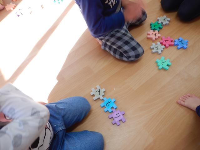 ぬりえでは図形を塗りつぶすものと丸の中を円を描くようにして塗りつぶす塗り絵を用意しました。お友達同士で「上手だね」「その色かわいい」と褒め合いながら行なっており、ふわふわ言葉で溢れていました。
