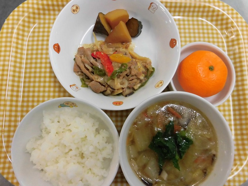 今日のメニューはごはん、春雨スープ、チンジャオロース、中華大根きゅうり、みかんでした。青椒肉絲の「青椒」はピーマン、「肉絲」は細切りの豚肉という意味です。谷里保育園のチンジャオロースは赤、黄ピーマンではなく、赤と黄色のパプリカを使用しています。そのため、ピーマンの苦みは感じず、パプリカの甘みが広がり食べやすくなっています。