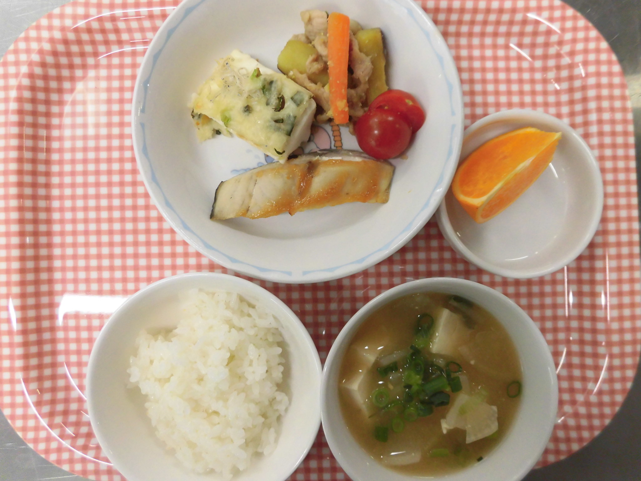 今日のメニューはごはん、みそ汁、サワラの西京焼き、さつまいものきんぴら、はんぺんのチーズ焼き、オレンジでした。はんぺんのチーズ焼きは今月の新メニューです!はんぺんに、マヨネーズをぬり、しらす、万ネギ、チーズをのせて焼きました。