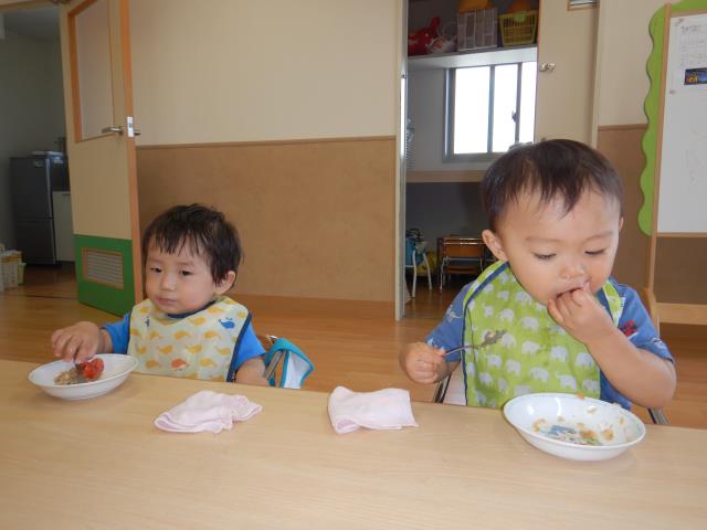 急にぽつぽつと雨が降ったりやんだり、忙しい天候でしたね。お誕生会後、ハーベストへ行ったり、お部屋に戻り玩具で遊んだりしました。お友達同士で玩具の取り合いをし、お友達が返してと手を伸ばす姿を見て、返してあげられました。「かえしてあげられたのね」と声を掛けると、とてもよい表情をしていました。関わりでいろいろな思いを感じていることに成長を感じました。橋爪