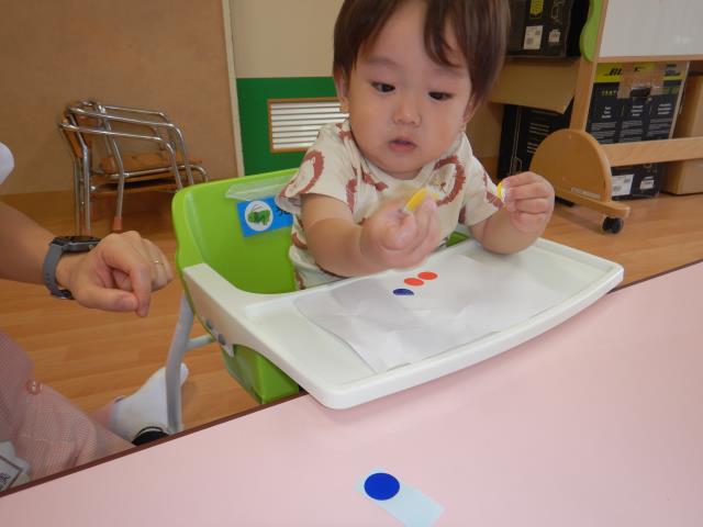 シール貼りでは、シールを渡すと指でシールを剥がしたり、紙に貼ったりする子がいました。