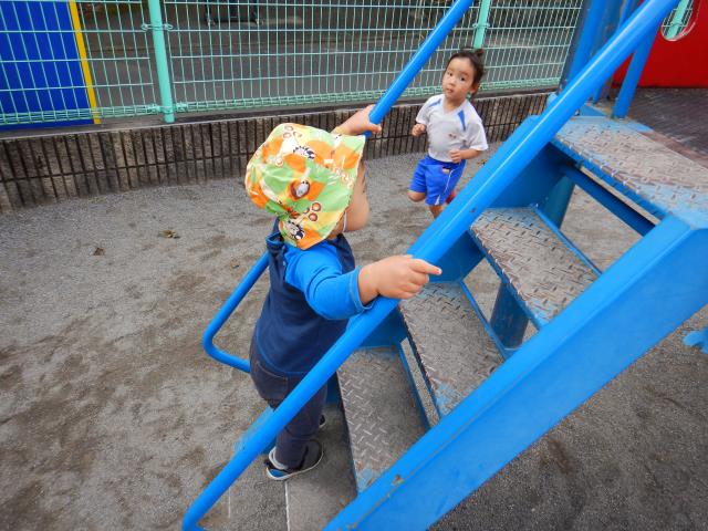 今日は、園庭とスロープで遊びました。スロープにいるお友達は、幼児組のお兄さん、お姉さんがを窓のところから見て、手を振る子などアピールをしていました!