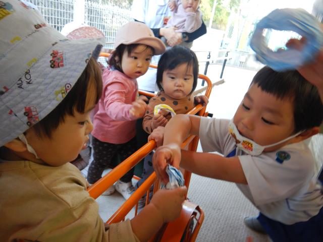秋風が気持ちの良い一日でした。テラスに出て園庭のお友達に「おーい」と声を掛けたり、飛行機やヘリコプターの音が聞こえると「あー」と指を差し見付けられると、バイバイと手を振り、ニコニコ笑顔がたくさんみられました。玩具の取り合いをしている時に、「○○ちゃんかして、してごらん」と言い、もう一人のお友達に「どーぞしてごらん」というと貸してあげられる姿が見られました。二人のお友達に出来たことをほめるとニコニコ凄く嬉しそうでした。心の成長が見られました。