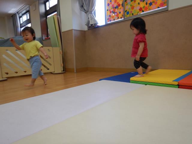 今日は、雨が降ったり止んだりでした。今日もお部屋で、マット遊びやマットを階段にしたりなどして遊びました。階段を作ると、下を見て段差に気をつけて歩く子やハイハイで登って、お友達に追いつこうと頑張っている子がいました。