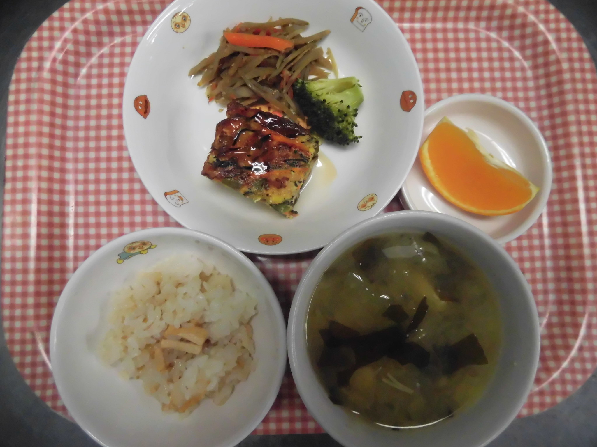 今日のメニューはきつねごはん、みそ汁、千草焼き、きんぴらごぼう、ブロッコリー、オレンジでした。