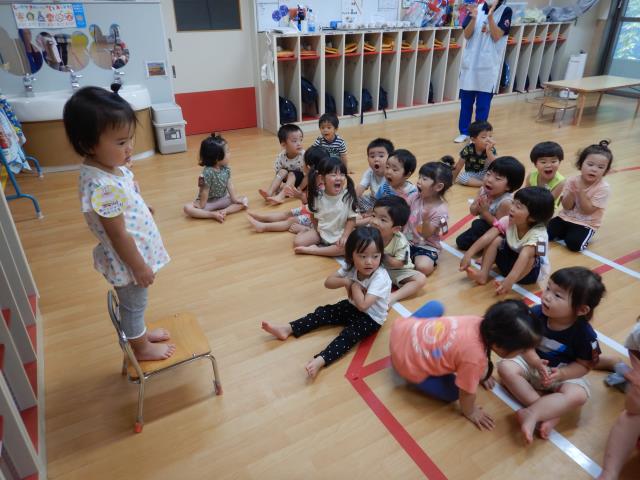保育園の向かいの木から沢山のセミの声が聞こえ、子ども達に「セミがいっぱいだね!」と会話をすると、「10匹いるんじゃない?」と想像がいっぱい広がっていました♡体育指導ではブリッジ、逆立ちの動きに挑戦中!!よく見て、真似をする。やってみる!の積み重ねで成長が見られます! 清水