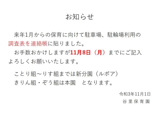 本日、お便り『ル・ボアのお知らせ』をお配りしました。住所・電話番号、内覧会のお知らせ等記載しましたのでご確認下さい。お便りはホームページ内の「園からのおたより その他」でも見る事が出来ます。