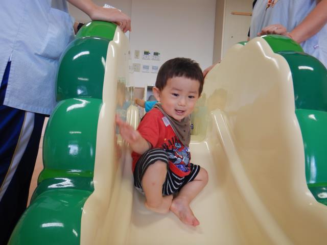 お部屋でマットの滑り台をしました。大好きなマットの滑り台!!マットの上まで行くと立ち上がり、手を振ったりとどんどん活発になっています。笑顔をたくさん見せ楽しんでいました。