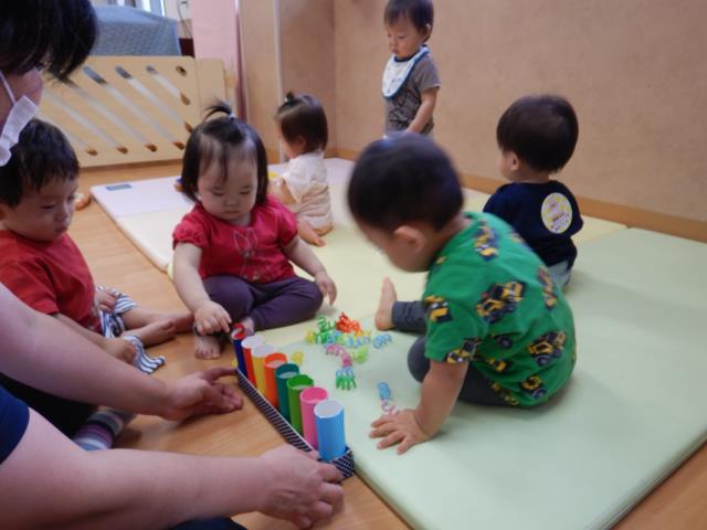 今日は、お部屋でブロックや園内散歩をしました。ブロックでは、穴が開いているブロックの場所に入れることが出来る子や回したり、転がす子も!