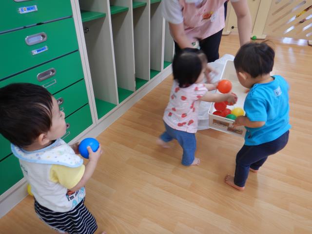 お部屋でボールを出すと、「わー!」と言ってボールを取りに行く子ども達!ボールを見つけ、両手に二つ持って転がす子もいました。