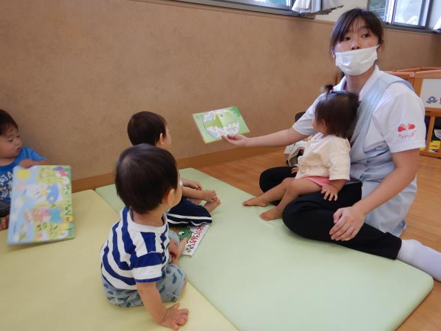 今日は、朝の会が終わった後に、マットの上で絵本を読みました。絵本を出すと、「あー!」と言って大喜びの子ども達!保育者が、「まあるい卵」の絵本に出てくる歌を唄うと、保育者の周りに集まり絵本に興味津々で、座って見ていました!