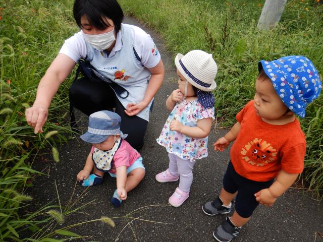 久しぶりにお散歩日和でした。多摩湖手前の土手へお散歩に行きました。子ども達の背丈ほどの高さの草を見て、そばに行き草花を触ってみたり、時より吹く風を感じながら、気持よさそうな表情を見せてくれました。子ども達同士の関わりも増え、いい子良い子をしたり、玩具を持っていき優しく差し出す姿があります。お片付けも上手になりました。「玩具を持ってきて」と言うとニコニコで運んできてくれます。お家でもお片付けのお手伝いをお願いしてみてください。可愛い姿が見せてくれますよ。橋爪