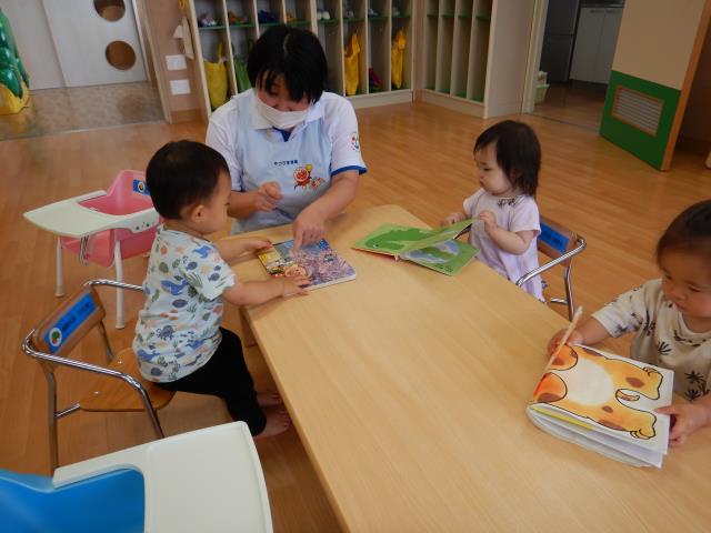 指先遊びや絵本を読んだり、自分の好きな物や遊びたいものをじっくり楽しんでいました。指先遊びでは、あひる組さんからペットボトルのふたを容器の穴に落としていく玩具を借りて遊びましたが、やり方が分かった子は集中してじっくり遊んでいました。