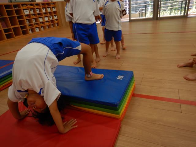 今日は、ブリッジ歩きの練習!!手の指の向きがきちんと足の方へ向いているか、お腹が高く上がっているかなど気を付けて練習していましたよ。ブリッジ回転が上手に回れるために何度も歩いていました。