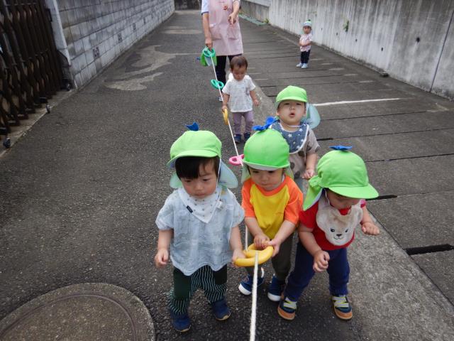 お散歩ロープに慣れてきたら歩く距離を伸ばしていきます。あひる組のうちにどこまで行けるか楽しみですね。