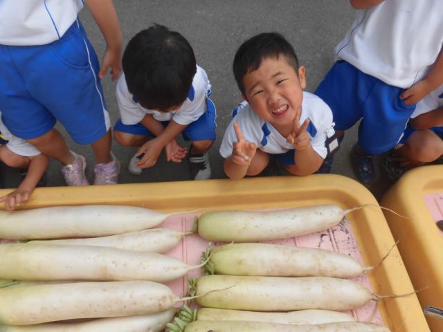 楽しみにしていた分「大きい」「すごい」と嬉しさも倍になっていました。また大根を見るときもお友だちが見やすいように「ここいいよ」「どうぞ」と場所を譲ってくれる優しい姿もありました。日頃から優しさ、思いやりで溢れています♡
