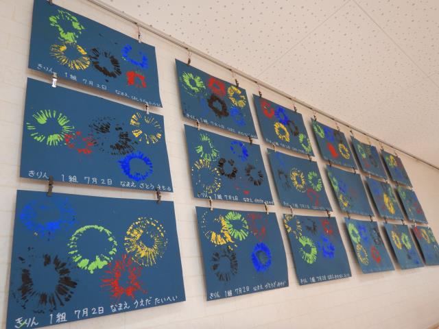 7月に入り廊下の製作も「夏」に切り替え☆夏といえば…花火!このような状況で花火大会などにも行けない分、きりん組の子ども達がきれいな花火の製作を作りました。今年は「東京オリンピック」も開催されるということで、五輪の色と花火の色がリンクしています♩♩廊下がぱっと華やかになり夏気分です☺