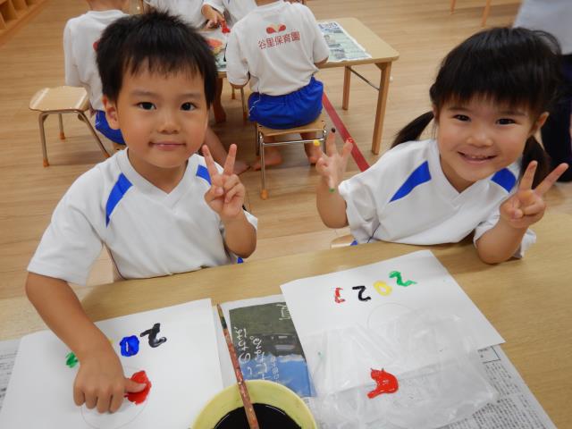 そんな今日はうちわの製作を行ないました。5指を使いオリンピックを表す5色の色つけました。指で絵具を触るというなかなかない経験に興奮気味のきりん組でした(笑)