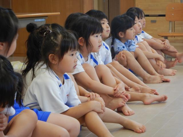 体操では、基本的な柔軟体操からもう一度行ないました。返事は何故必要なのか、お友達を応援することで自分も上手になる、と信じて行なっています。