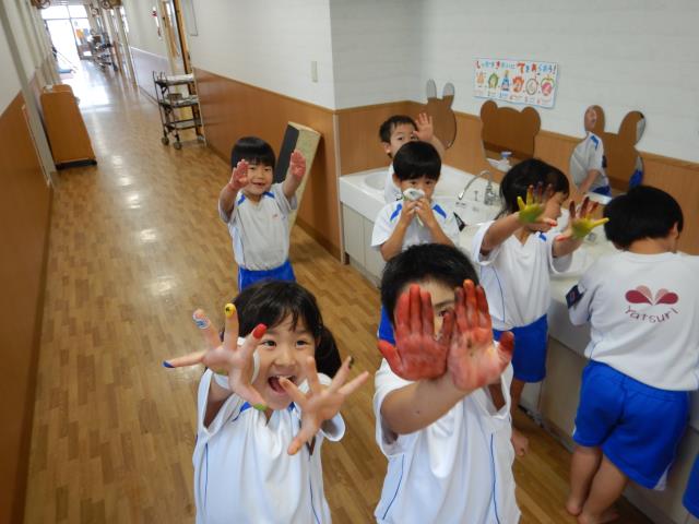 指で絵の具を塗る感触が珍しく、とても楽しんで行なっていました。自分たちで名前を書いたため、ぞうぐみの「ぐ」の文字が反対になっている子もいましたが、それもまた味わい深い製作となりました。