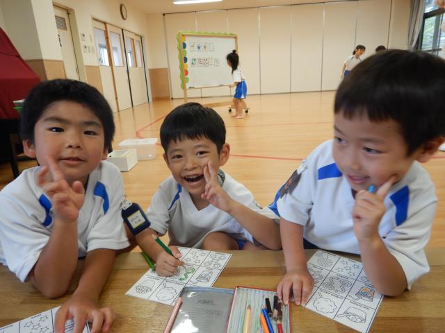 今日は英語指導で塗り絵をしました。とても細かい塗り絵でしたが、自分でイメージを膨らませ、楽しそうに行なっていました。個性豊かな塗り絵が沢山できました(^^)/次回の英語指導でビンゴをする際に使うようです!楽しみです。