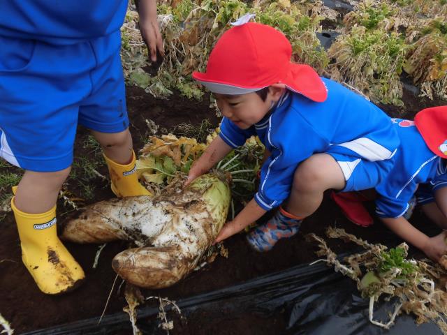 大人でも重たい大きい大根も子ども達は腕をまくり、よいしょよいしょ!と声を出しながら力を込めて抜いていました!