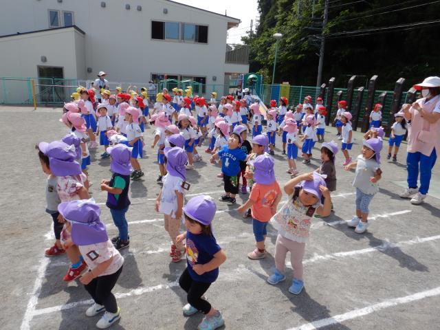 今日は2組のお友達が初めて、園庭に出て朝の会を行ないました!最初は見学しているだけの子ども達でしたが、かっこいいお兄さんお姉さんを見ているうちに自分達から線に並んで参加する姿が見られました!
