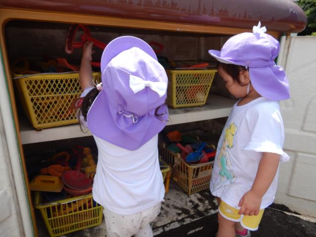 2組が水遊びを行なうために準備をしていると、1組のお友達も玩具を持ちバケツに溜まった水をバシャバシャとして楽しんでいました(*^-^*)