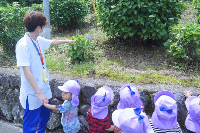 気温も高く、夏がもうすぐそこまで来ていますね☼うさぎ一組は、多摩湖手前の土手までお散歩に行きました!お友達同士で手を繋ぎ、歌や道中に咲いていたアジサイなどを見つけ、「ピンクだ!」「かわいい♡」と言っていました(^^♪土手に着くと、原っぱで追いかけっこをしたり、花や蝶を見つけてお友達同士でお話をしながら、楽しんでいました♪たくさん遊び、水分補給もきちんと行ないました!帰りには狭山神社を通りそこでも水分補給をして休憩をしました!!