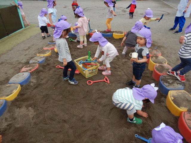 日中は日差しも強く、夏日でしたね☼今日は、園庭遊びをしました。園庭に出ると、白線で描いた「〇、△、□」の中に保育者の声掛けで入り、「丸に入って~!!」というと、どこに〇があるかを確認して、走って輪の中に入る姿が見られましたよ(*^-^*)その後は、園庭でそれぞれが思い思いに遊びました。中にはあひる組のお友達と一緒に砂場でお山を作って遊ぶお友達も!