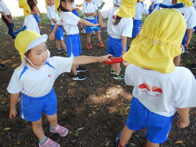 また、今日はリレーのバトンの受け渡しを練習しました!保育者が見本を見せると「ぞう組はこんなかっこいいバトンパスをやってたんだ~✨」と運動会のリレーを楽しみにしていました!