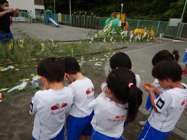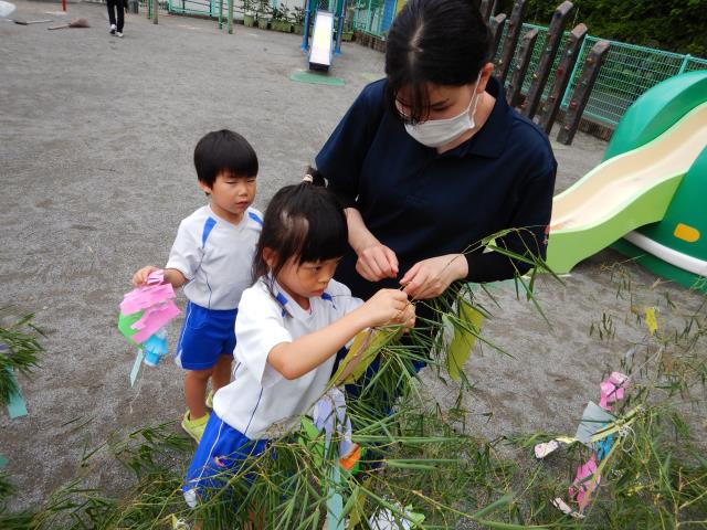 大笹飾りを行ないました!結びつけるのが難しいお友達は先生と一緒に行ない、自分の付けたい位置にくくりつけました。最後には願い事が叶いますように、とお祈りもしました。