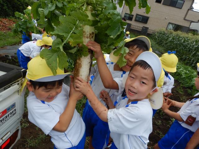 大根抜きに行きました。行きは歩いて行ったのですが、ぞう組のペースの速さに30分を予定していた道を20分で到着しました!大根抜きの際には、立派すぎる大根に最初はなかなか抜けない~!と苦戦していましたがコツが分かると男の子が女の子に教えてあげたり、一緒に抜こうと協力して一つの大根を上手に抜いていました!