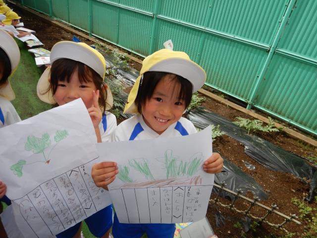 夏野菜が育ってきたので、観察をしてどのように育っているか絵日記を書きました!緑の葉っぱが何枚あるかを見たり、大きさを他の芽と比べてみたりと色々な発見がありました。