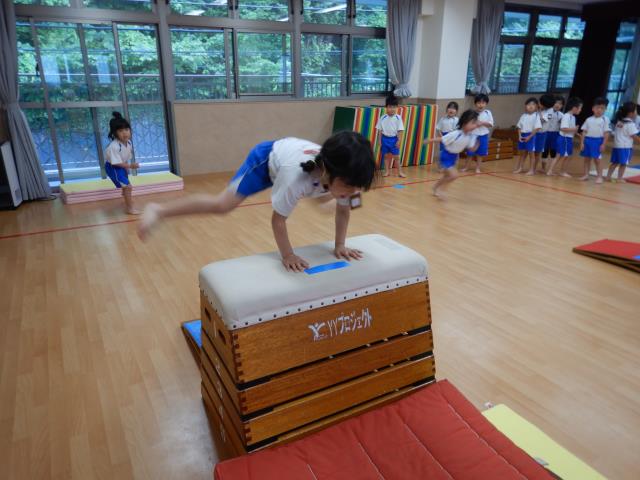 跳び箱では、集中して行なうこと。返事でお友達を応援することが出来ることを伝えています。自分の目標に向かって集中して取り組んでいます!