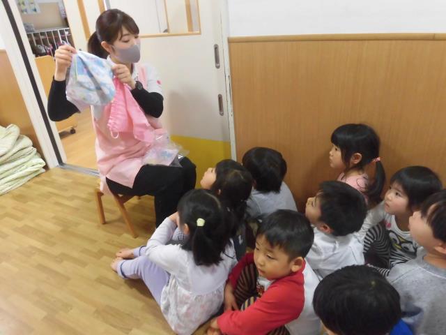 来週から進級プレ保育が始まりますが、既にお着替え袋の中にハンカチの予備を2枚入れているお友達がいました!ハンカチを忘れた時や汚れてしまった時には、予備があればきれいな物を使えることをお話しています。ハンカチの予備などの用意がまだできていないご家庭は、来週までにご用意をお願い致します。