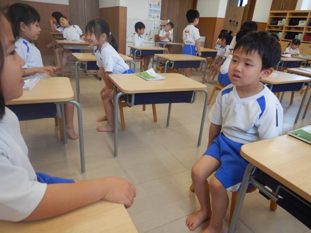 お休み中、どのように過ごしたかを朝の会で2人組になって発表しあいました。「食器洗いのお手伝いをした!」「体操毎日やってたよ」などと嬉しい言葉が沢山聞かれました。
