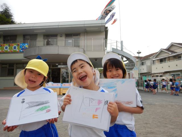 みんなで鯉のぼりをよく観察し、自由画帳に描きました!どんな模様をしているか、一つ一つの鯉のぼりの大きさはどう違うか、風車はどんな模様をしているか。子ども達の観察力の高さに驚きました(*^▽^*)可愛い鯉のぼりたちが沢山です!