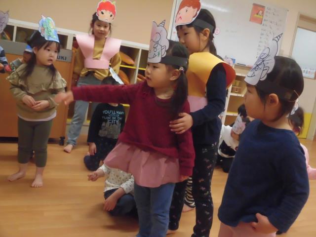 豆まき会では“鬼のパンツ”や“豆まき”の歌を唄ったり「おには~そと!ふくは~うち!」と大きな声で叫びながら自分の中の様々な鬼を追い払うことが出来ました!